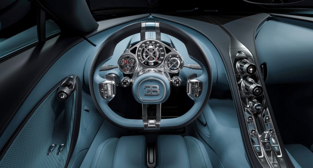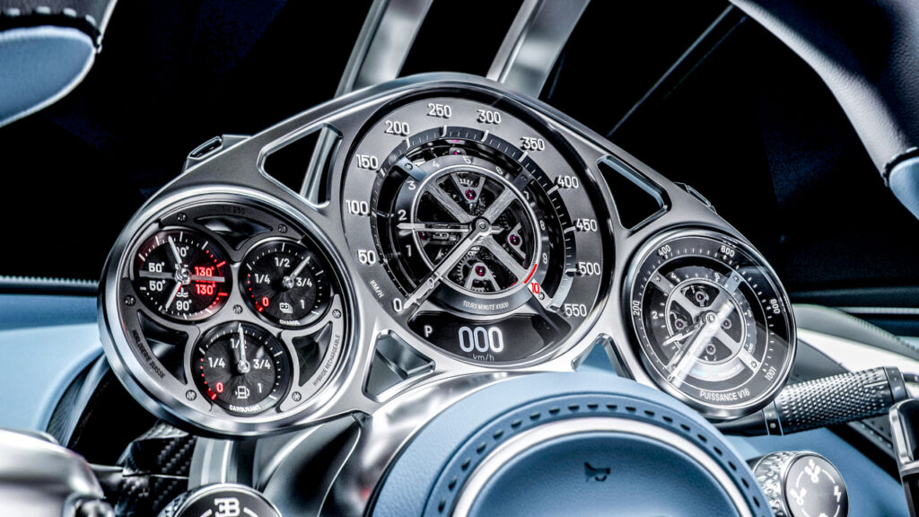The forthcoming $4 million Bugatti Tourbillon attempts to exemplify this aesthetic, with a lack of visible screens anywhere in the vehicle, beautifully rendered billet metal switchgear for all regularly-used functions, and, most notably, an instrument panel inspired, and built, like the ultra-hypercar’s namesake mechanical timepiece, by Swiss watchmakers.
