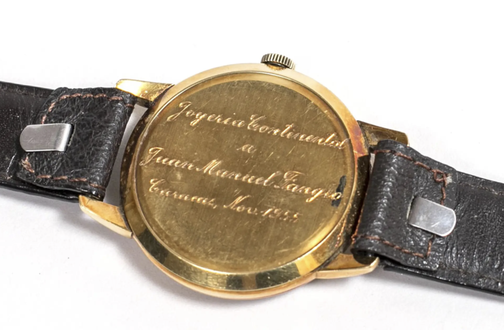 He wore this Omega regularly until his death. But it’s part of a group of controversial items that Fangio’s heirs and foundation wishes wouldn’t be sold.