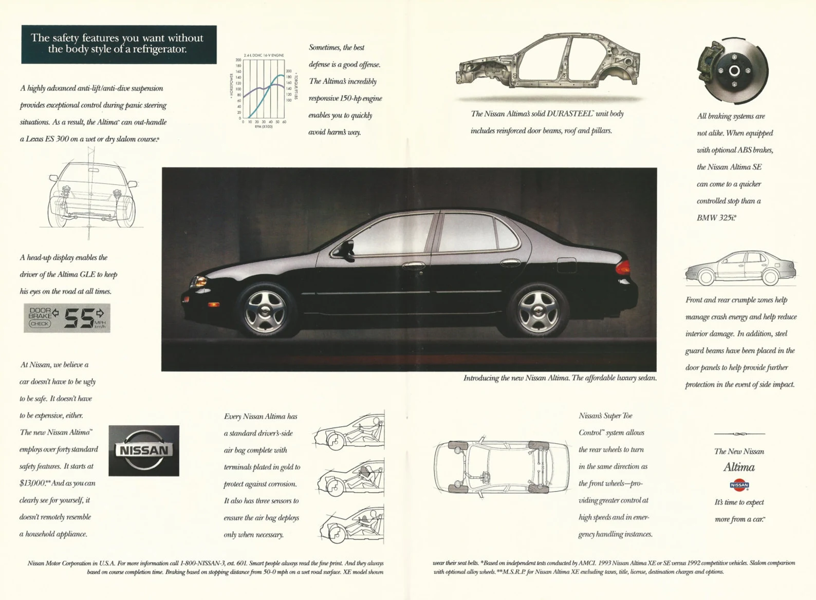 While it didn’t have any overtly sporty pretensions, the Altima—which debuted just after the third-generation Maxima—also had a strong sales pitch. It was inexpensive, built in the states, and came with a powerful KA24DE engine (150 hp, when just a few years earlier 160 hp was enough to label a larger V6 counterpart sporty!) and a competent automatic (with an available manual). You could even fit an optional limited-slip differential, rare at the time and certainly not standard in mainstream non-sporty front-drivers even today.