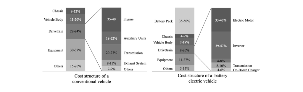 Another way to look at it is in terms of percentage of the total cost of the vehicle, and for this I have to rely on studies that make broad generalizations and assumptions and are thus really only good for, well, generalizations. This UC Davis study found that the battery makes up as much as 50% of the total cost to produce the vehicle, whereas a conventional internal-combustion powertrain is roughly 25% of the total cost.