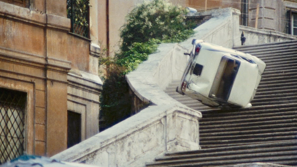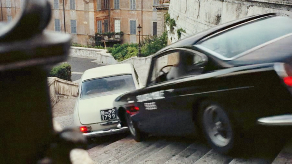 Again: no special effects. It may or may not have happened in real life, but in shooting this movie, they absolutely sent a 1963 Ferrari 250 GT 2+2 and a 1966 Lancia Flavia Coupe careening down the actual 250-year-old multitiered staircase leading to the Piazza di Spagna, one of Europe’s most celebrated tourist attractions and beloved public spaces. A fucking UNESCO site! The Lancia rolls!