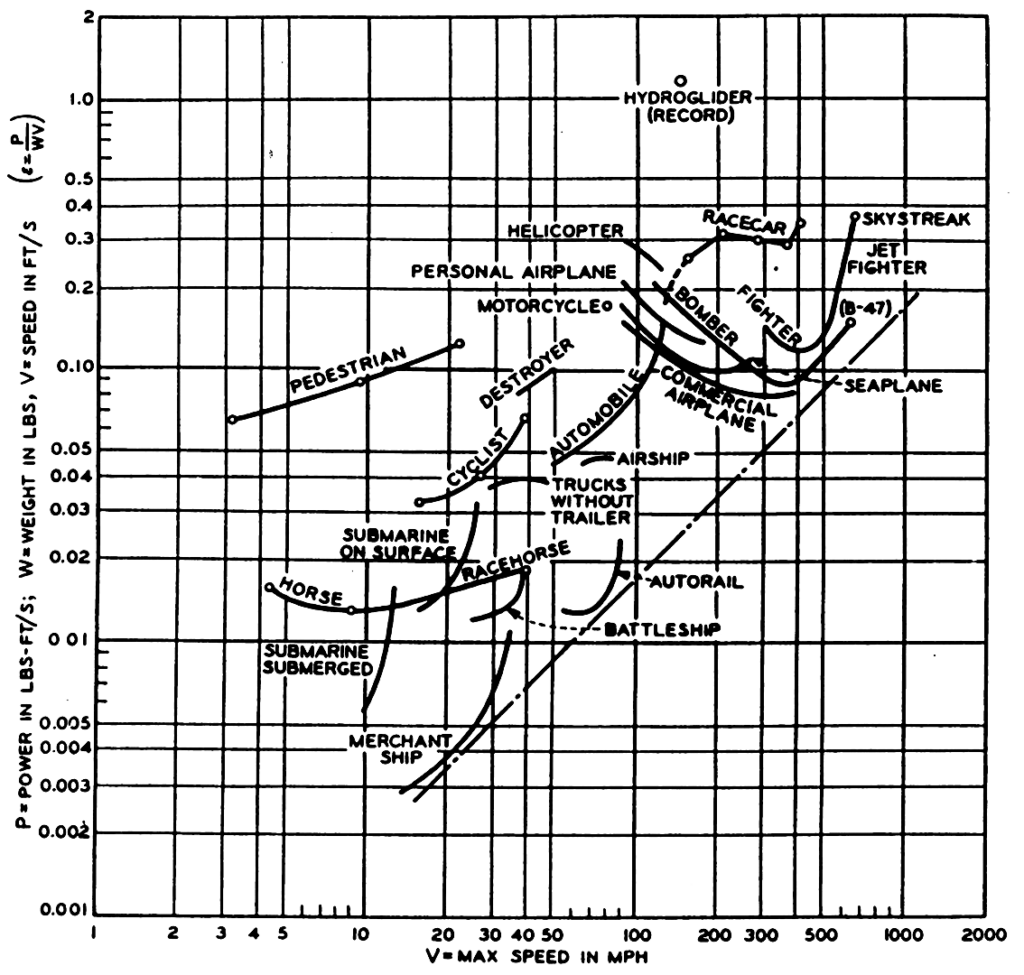 I knew about the Kármán line, the generally accepted altitude at which one has reached space. I did not know about the von Kármán–Gabrielli diagram, which is a fascinating way of showing the relative efficiency of a broad variety of vehicles. It’s a tool for comparative analysis—what’s the best vehicle for achieving a particular outcome? And given von Kármán’s expertise in aerodynamic forces, the central theme is balancing the speed of travel with the associated aerodynamic drag. In other words, slower is better, as increased speed equals increased drag, requiring more energy. Or, in von Kármán’s and Gabrielli’s own words, in the title of the paper introducing the diagram, “what price speed?”